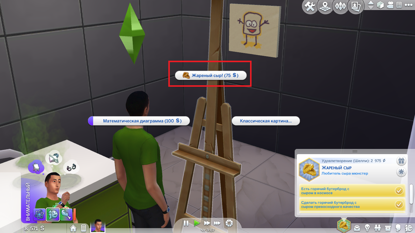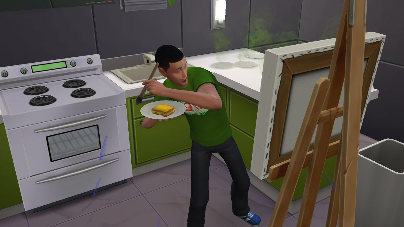 Вторая же особенность очень оригинальная и забавная: если нажать на сима и выбрать функцию «Создать жаренный сыр», в руках у вашего сима появится тарелка с готовым жареным сыром, но самое интересное то, что можно одновременно есть и рисовать его.