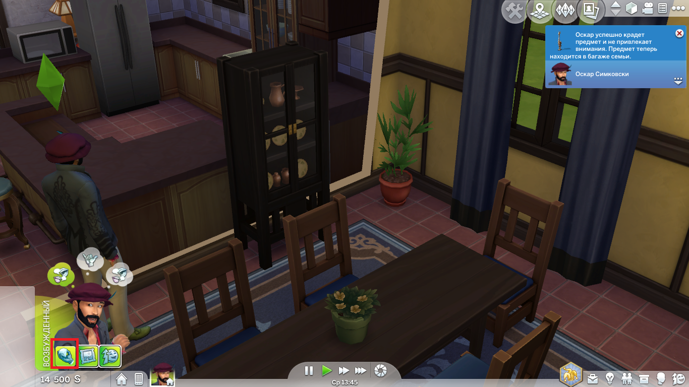 После кражи предмета нас оповещают, что все прошло успешно, и у сима появляется новый возбужденный мудлет «Бодрящее грабление». Кроме того, с каждой кражей повышается уровень навыка «Пакости».