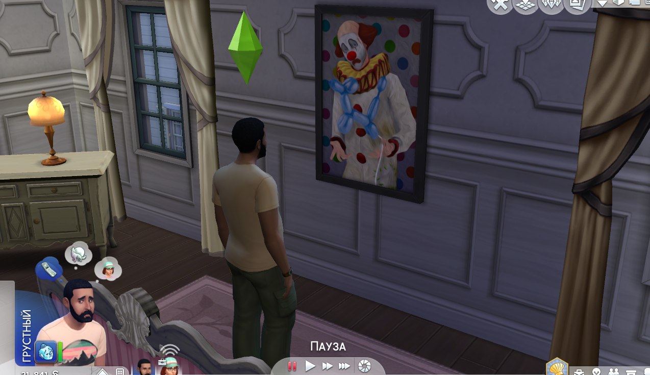 А если выполнить действие «Смотреть» над картиной с клоуном, то есть вероятность, что у сима появится грустный мудлет «Печальный клоун — печальное зрелище».