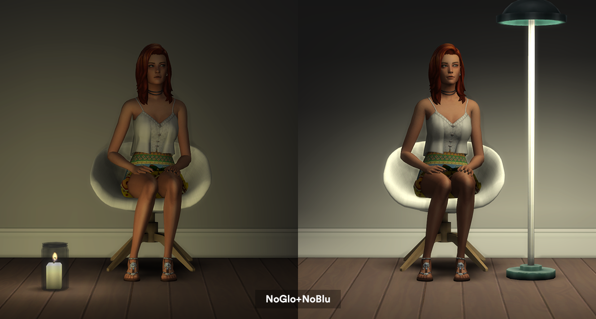 EA использует тоже освещение, которое они используют в CAS на симах в игре, чтобы сделать их более яркими/придать им живой вид и сделать их яснее в темноте. Я не поклонник этого эффекта, потому что симы выглядят засветленными фиолетовым / синим светом в любых условиях освещения, даже при нулевой освещеннности это присутствует. Я избавился от этого полностью и симы теперь естественно реагируют на освещение.