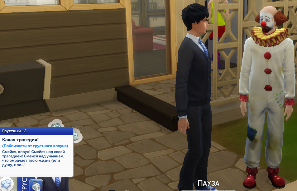 Пребывание с этим клоуном, увы, кроме грусти и уныния не даст ничего. Иным словом, пока сим находится рядом с печальным клоуном у него будет оставаться мудлет "Какая трагедия!", а чтобы мудлет исчез нужно отдалиться от клоуна на определенное расстояние.