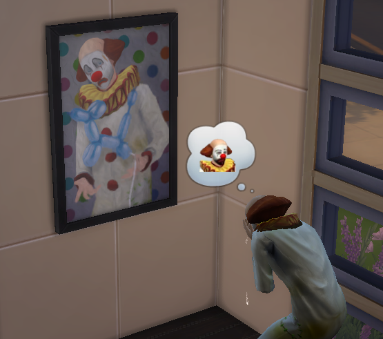 Если все активные симы на максимальном расстоянии от клоуна, ему станет еще грустнее :( Он подойдет к картине "Грустный клоун" и начнет плакать.