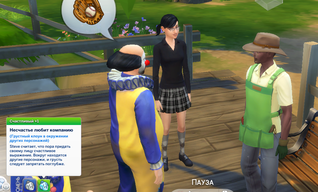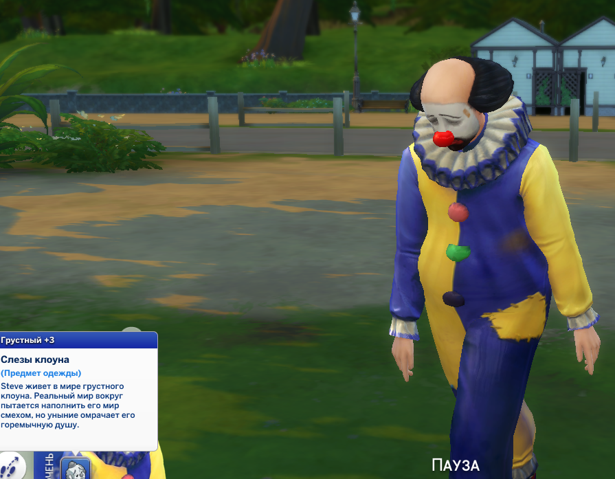 Итак мы создали клоуна, давайте посмотрим чем им можно заняться. Ну, в первую очередь опять видим грустный мудлет "Слезы клоуна". И пока сим в костюме грустного клоуна мудлет не исчезнет (Даже одежда печального клоуна несет сплошную грусть, прям мистика какая-то).