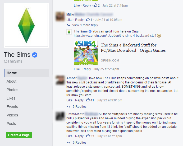 Вот сценарий, который продолжается уже на протяжении нескольких недель: команда The Sims отвечает на небольшую группу комментариев, которые связаны с каталогом, в то время как большинство других комментариев, связанных с дополнениями уходят ниже, потому что команда не отвечает на них.