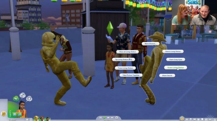 - Уличный артист. Живая статуя — это один из уличных артистов, которых вы можете встретить на улицах Сан-Мишуно. Чтобы наблюдать за ним, нужно кликнуть на него и выбрать соответствующее действие. После этого с ним доступны следующие действия: помахать, испугать, дразнить и подкинуть чаевые. Подкинув чаевые, артист-статуя подарит вам костюм золотой статуи, надев которую вы сами сможете стать таким уличным артистом и собирать чаевые. Есть два варианта золотого костюма: космонавт и ковбой;