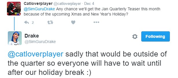 SimGuruDrake в твиттере сообщила, что информацию о новом квартальном тизере мы получим уже после новогодних праздников.