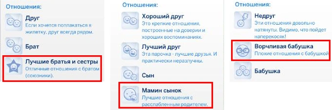 Примечание: новые виды родственных отношений можно увидеть, наведя курсор на пиктограмму сима на панели отношений.