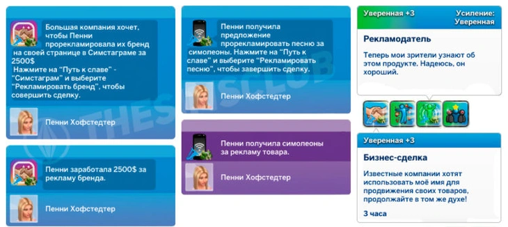 По достижению вашим симом отметки в 100к читателей в Симстаграме, он начнёт получать предложения от маленьких компаний, которые ваш сим сможет выполнить ради прибыли. Предложения становятся крупнее с увеличением знаменитости или количества читателей в Симстаграме.