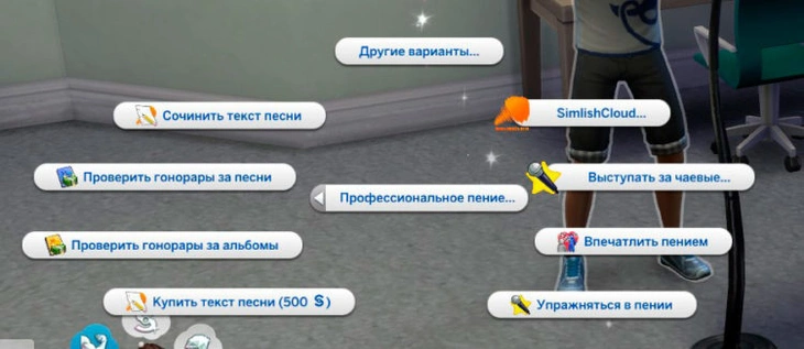 | 1 | Ваш персонаж делает первые шаги, чтобы стать профессиональным певцом! Ему нужен ясный ум и здоровое мировосприятие, чтобы писать проникновенные тексты песен и записывать песни! Новые взаимодействия: «Сочинить текст песни» и «Записать песню для SimlishCloud». |