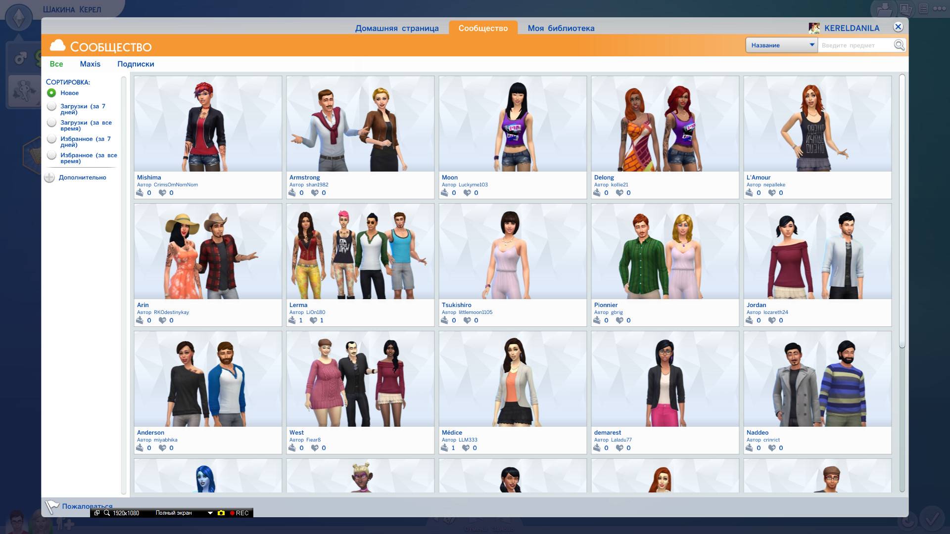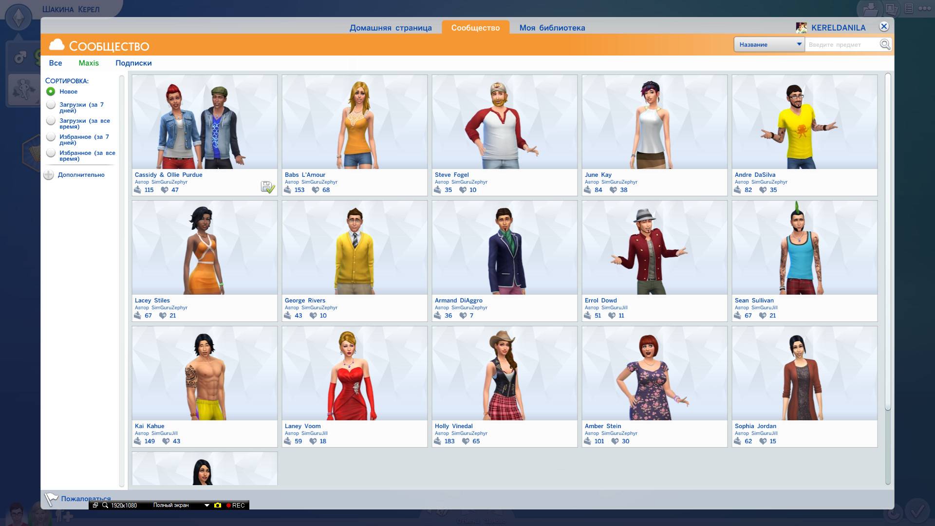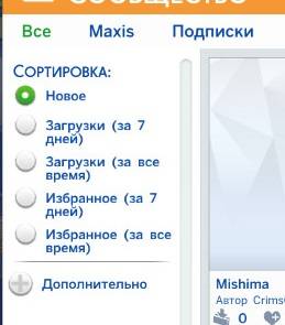 Мне кажется мы что то упустили? Ах, да! Точно! Над панелью "сортировка" есть 3 чудесных вкладки: "все" (включена по умолчанию), "Maxis" (Персонажы созданные "SimGuru") и "Подписки".