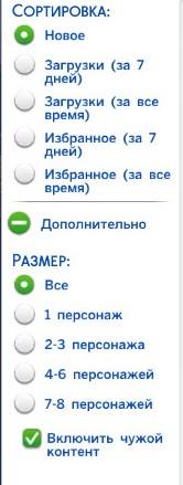 Нажав на вкладку "дополнительно" вам выпадет список с ещё большем количеством вариантов сортировок! Вы же любите сортировать?! :-) С помощью новых вариантов сортировки вы можете выбрать сколько персонажей вам нужно в 1 семье! 1 или 5 персонажей? Выбор за вами! Так же тут есть вкладка "Включить чужой контент" - её функция проста, ограничивать вас от материалов на из игры The Sims 4, а сделанные пользователями вручную.