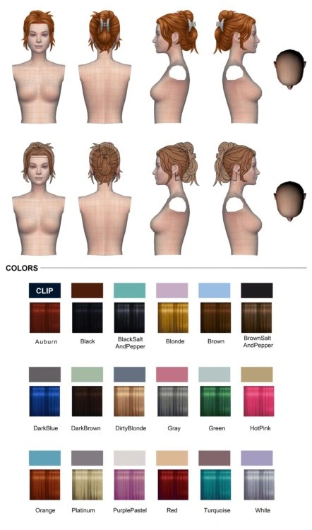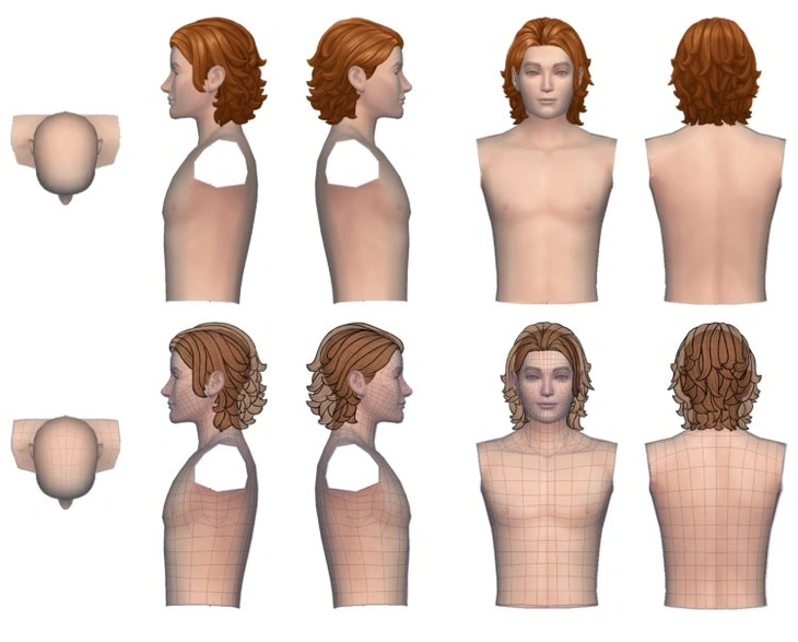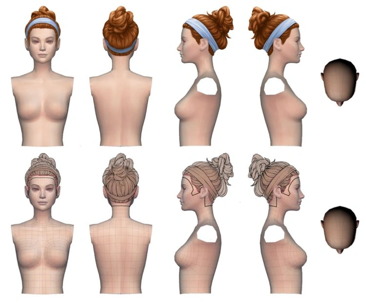 Во-первых, важно заметить, что обычно на создание причёсок уходит больше всего времени среди того, что мы создаём с внешними партнёрами. Процесс начинается со сбора справочных фотографий людей с причёской, которую мы создаём, чтобы у нас было несколько примеров того, как эта причёска может выглядеть. После этого наши художники рисуют их интерпретацию этой причёски, наложенную на лысого сима. Они создают две версии таких зарисовок: одна — непрозрачная, она демонстрирует, как должен выглядеть финальная поверхность, а другая — прозрачная, чтобы у модельщика был ясный пример формы и объёма причёски в сравнении с расположением головы сима. В течение этого времени происходят изменения, основанные на отзыве нашего арт-директора. Хоть этот процесс не сильно отличается от других вещей, количество деталей в каждой причёске подразумевает, что такие вещи попросту дольше создавать, чем предметы и одежду. В итоге, это влияет на наш график разработки; как правило, мы ставим выбор причёсок перед предметами и одеждой, чтобы у наших художников и внешних партнёров было больше времени на работу с ними. Принимая в учёт голосования в рамках этого проекта, это означало не только то, что мы не могли ждать, пока включим [причёски] в голосования за предметы/одежду, но и то, что у нас даже не будет времени на проведение отдельного голосования за причёски. В общем, как только у нас на руках были результаты голосования за стиль [каталога], мы немедленно должны были начать работу над причёсками. Это было таким препятствием для этого проекта, когда мы не могли понять, как нам включить голосование за причёски без откладывания сроков нашего графика разработки.