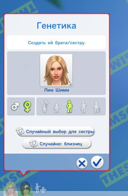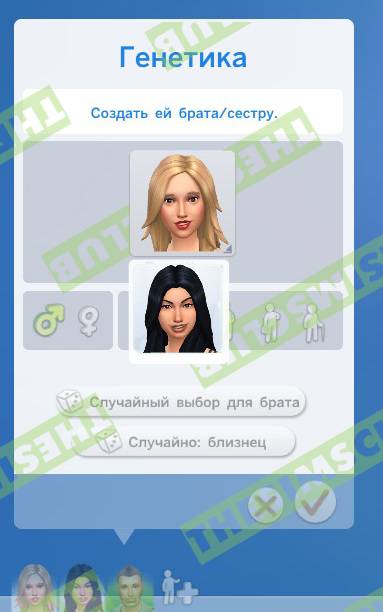 И последние кнопки, отмены создания брата/сестры (в нашем случае) или подтверждение персонажа (то есть запись его в семью):