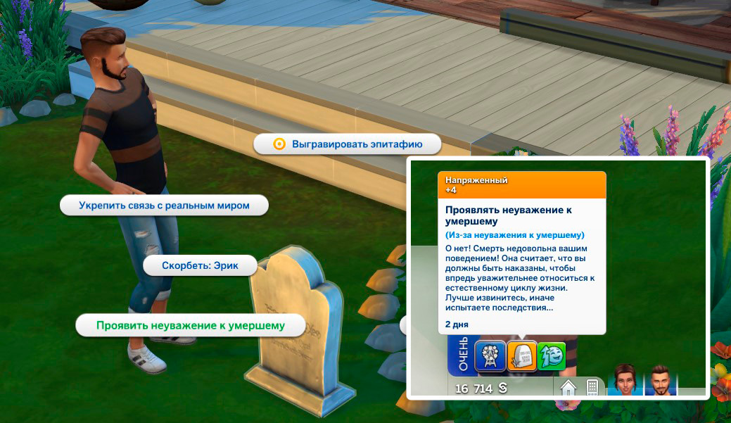 Чтобы стать зомби нажмите на любое надгробие в игре и выберите взаимодействие «Проявить неуважение к умершему». Смерть будет очень недовольна таким поведением, поэтому наложит на вас проклятие, о чем будет сообщено в мудлете. После завершения действия мудлета (2 дня) ваш сим будет превращен в зомби.