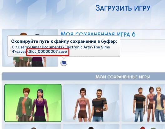 3. Наведите на иконку папки, чтобы узнать название файла сохранения (в моём случае это Slot_00000007.save);