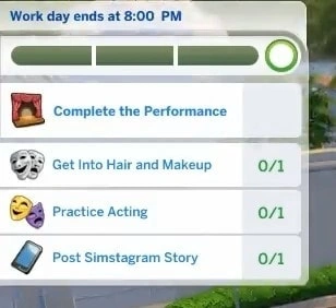 • У актёра будет специальный набор подготовительных заданий: например, улучшение конкретных навыков, репетиция сцен и исследование конкретных эмоциональных состояний, в которых вашему симу нужно будет войти;