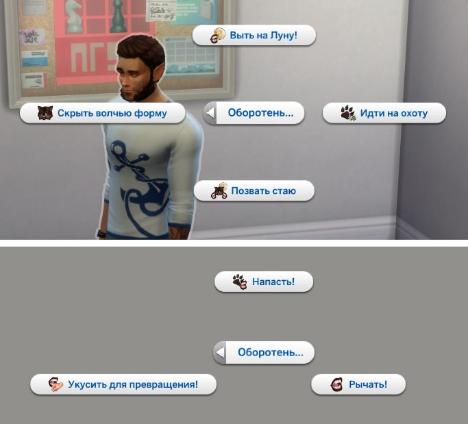 Как только ваш персонаж станет оборотнем, он будет автоматически превращаться в волчью форму в 20:00 (18:00 в Форготн Холлоу). В это время вам будут доступны взаимодействия из категории «Оборотень» при нажатии на персонажа. В 7:00 оборотень скроет свою волчью форму и будет выглядеть как обычный сим. Достигнув 4 уровня навыка Ликантропии вы сможете контролировать превращения.