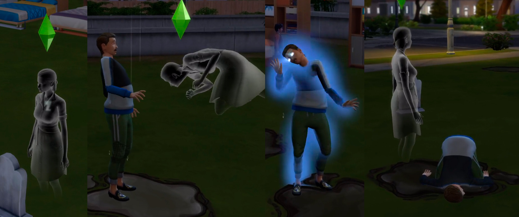 • Умершие от раскладной кровати являются (как их назвали на стриме) "энергетическими вампирами", которые могут высасывать из живых симов энергию. Кроме этого, они могут будить спящих симов и не давать им уснуть;