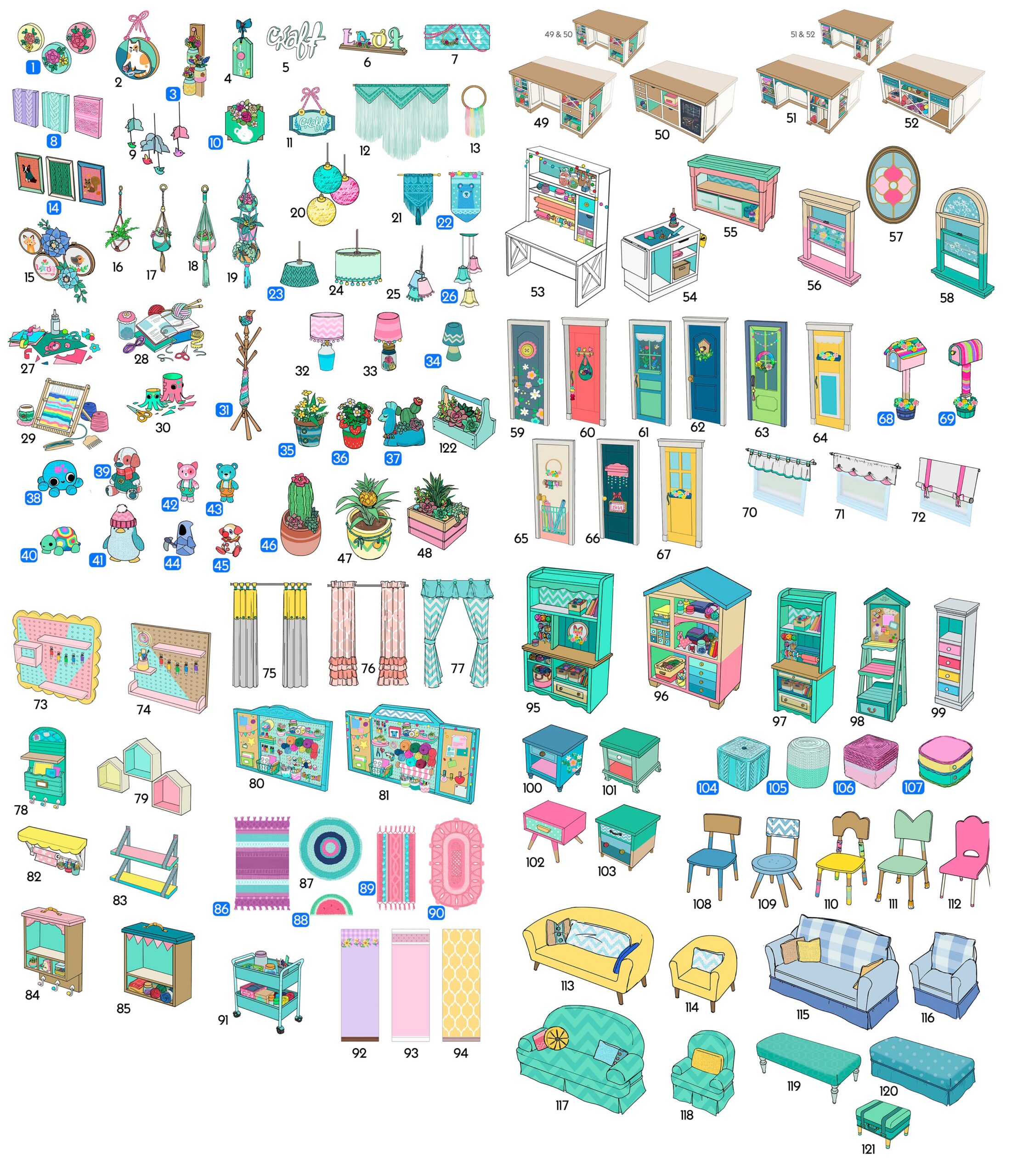 Предметы с синими номерами могут быть созданы симами с навыком вязания или появиться в режиме покупки и строительства, как и другие обычные предметы.