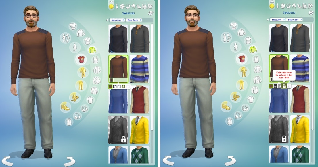 Более того, в отличие от карьерных заблокированных нарядов, примерить доступную для вязания одежду можно будет прямо в CAS. Это поможет вам выбрать интересующий наряд и узнать, какой уровень навыка необходим для того, чтобы связать его. Ранее нельзя было просматривать заблокированные предметы и разработчики рады, что реализовали эту функцию в рамках каталога сообщества, которую они планируют использовать в будущих наборах для The Sims 4.