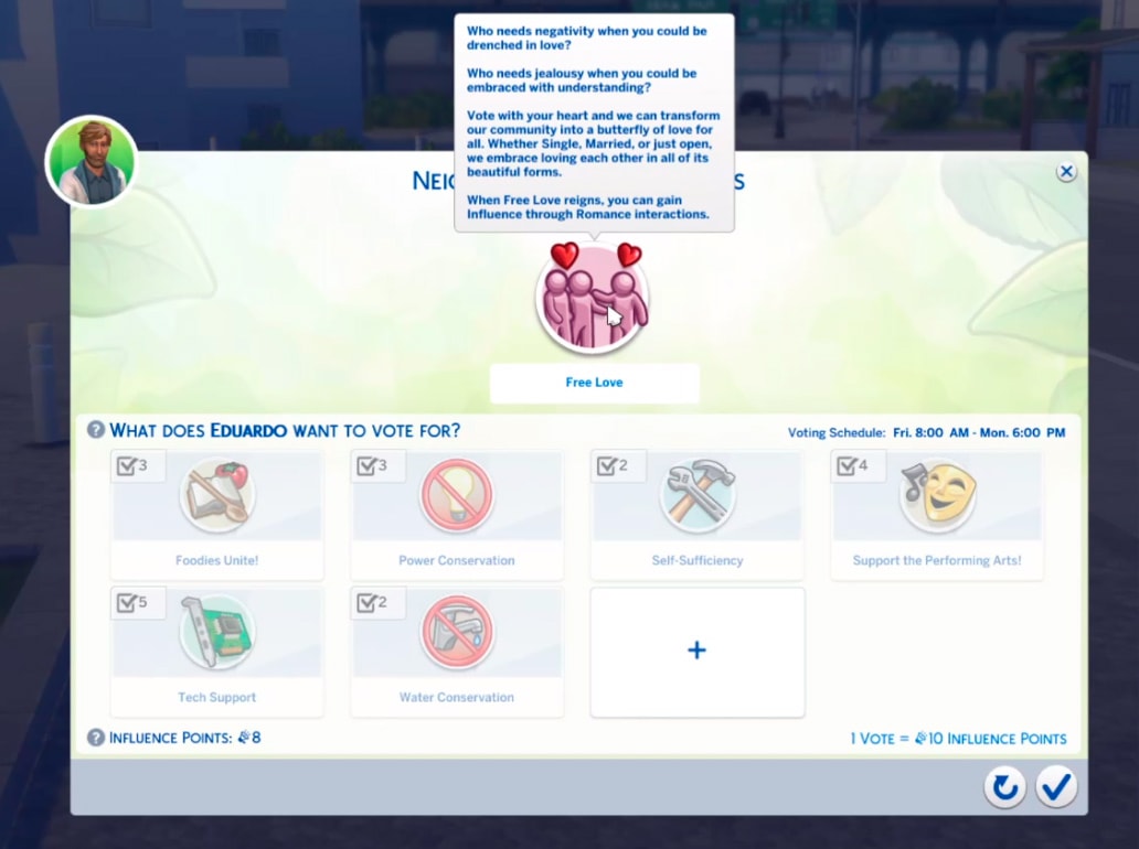 - За комплекс мер можно проголосовать сколько угодно раз, но каждый голос расходует 10 очков влияния. С помощью этих очков можно повлиять на других симов, чтобы они проголосовали за определенные меры;