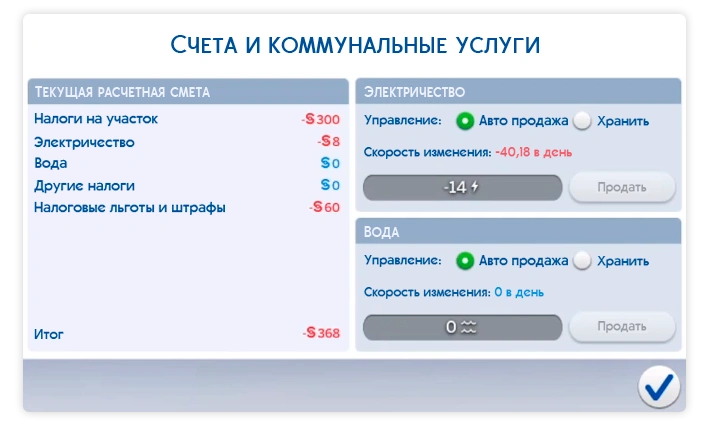 Новое окно коммунальных счетов, в котором детально расписаны расходы на налоги, воду и электроэнергию. Владельцы дополнения «Экологичная жизнь» смогут вырабатывать энергию и воду. К тому же, если вы будете потреблять меньше, чем производить, то остатки сможете продать.