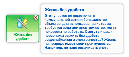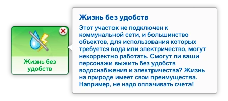 Как только вы отключите свой участок от снабжения электричеством и водой, у вас появятся уникальные действия, связанные с жизнью без удобств, которые позволят вам экономно расходовать ресурсы! Также вы всегда можете индивидуально настроить, какие объекты могут их использовать, а какие — нет!