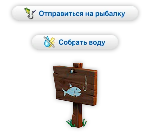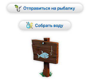 Для того, чтобы собрать воду из водоёма, нужно щёлкнуть на значок с разрешением на рыбную ловлю и выбрать действие "Собрать воду".