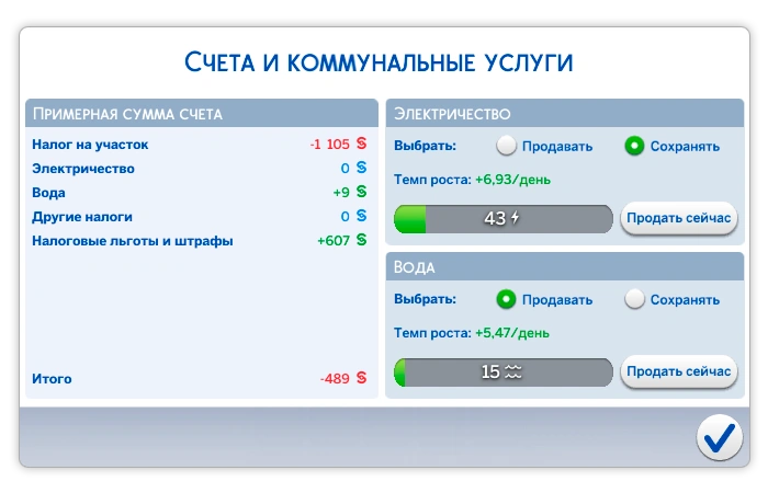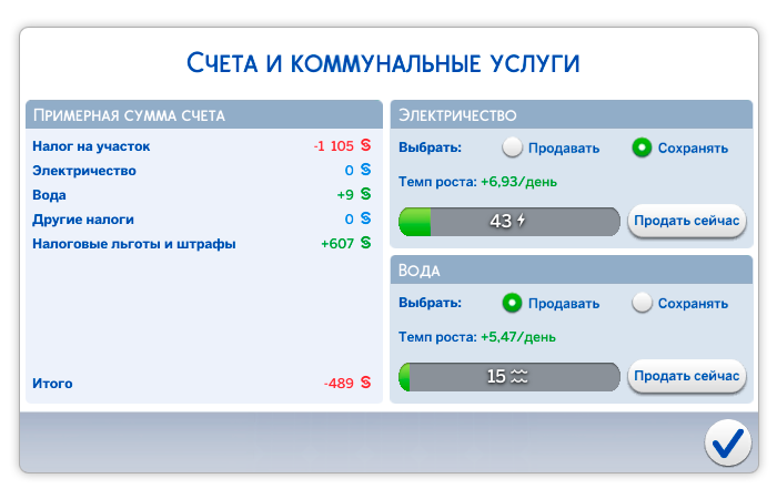 Сохранять или продавать излишки накопленных ресурсов вы можете с помощью панели счетов, которую вы можете посмотреть, нажав на почтовый ящик и выбрав действие "Показать сведения о счетах". Там же вы можете увидеть подробную сводку об оплате счетов и скорость, с которой вы вырабатываете ресурсы.