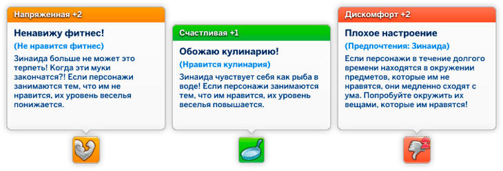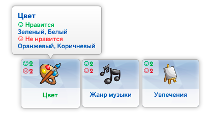 Предпочтения влияют на автономное поведение персонажей: они будут чаще заниматься тем, что им нравится, и избегать неприятных активностей. Например, персонажи, ненавидящие готовку, будут предпочитать долгому процессу приготовления пищи быстрый перекус из холодильника. Более того, увлечение будет сопровождаться символом, который показывает отношение персонажа.