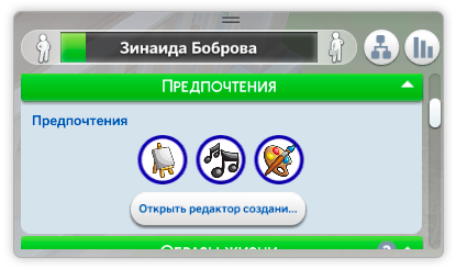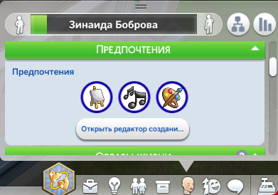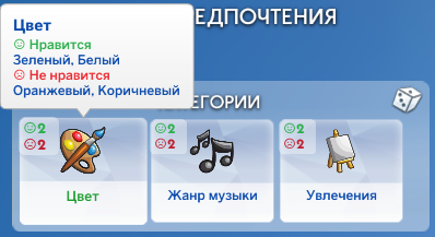 В режиме жизни предпочтения вашего персонажа можно посмотреть на панели Симология. Не бойтесь присваивать вашему персонажу новые предпочтения: вы в любой момент можете их изменить в режиме создания персонажа.