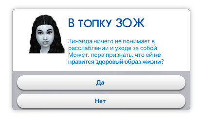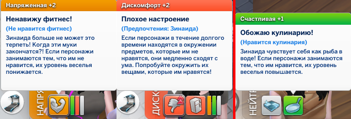 В режиме жизни вы будете наблюдать влияние интересов на настроение ваших персонажей. При занятии тем, что им нравится, их настроение будет улучшаться, а потребность в досуге — расти; при занятии тем, что они ненавидят, их досуг будет уменьшаться, а настроение из напряжённого перерастёт в дискомфорт.