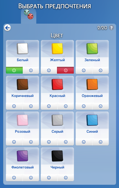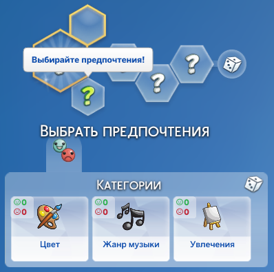 В режиме создания персонажа ниже иконки жизненной цели находится ячейка предпочтений. Вы можете выбрать, что нравится или не нравится вашему персонажу, нажимая на улыбающееся или грустное лицо внизу каждого вкуса. У персонажей может быть в сумме 20 предпочтений из всех трёх категорий.