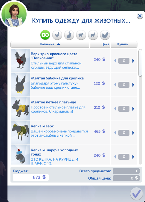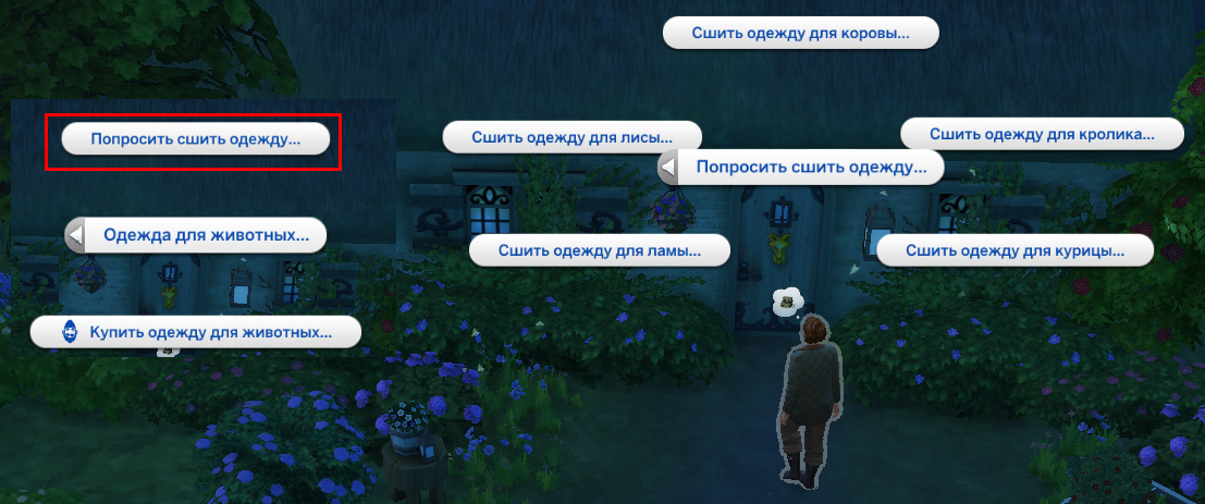 Поздоровавшись с ним, вы сможете приобрести одежду для кур, лам, коров, кроликов и лис за симолеоны.