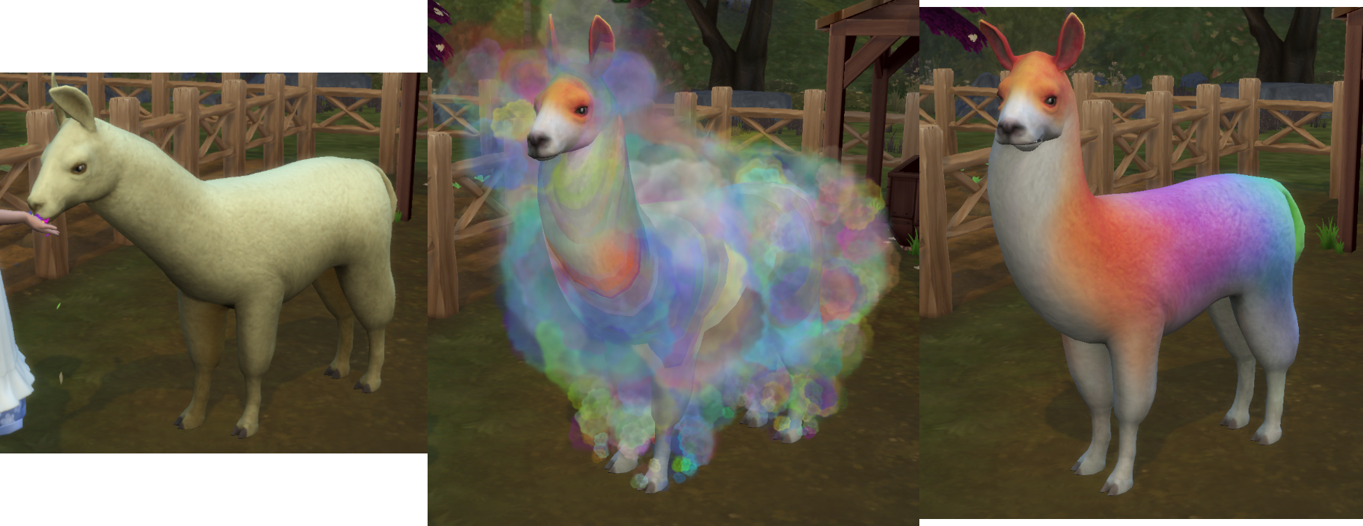 Получить шерсть необычного цвета возможно, скормив ламе лакомство. При этом она тут же поменяет окраску. Подробнее о получаемых цветах и необходимых лакомствах рассказано ниже в разделе "Лакомства".