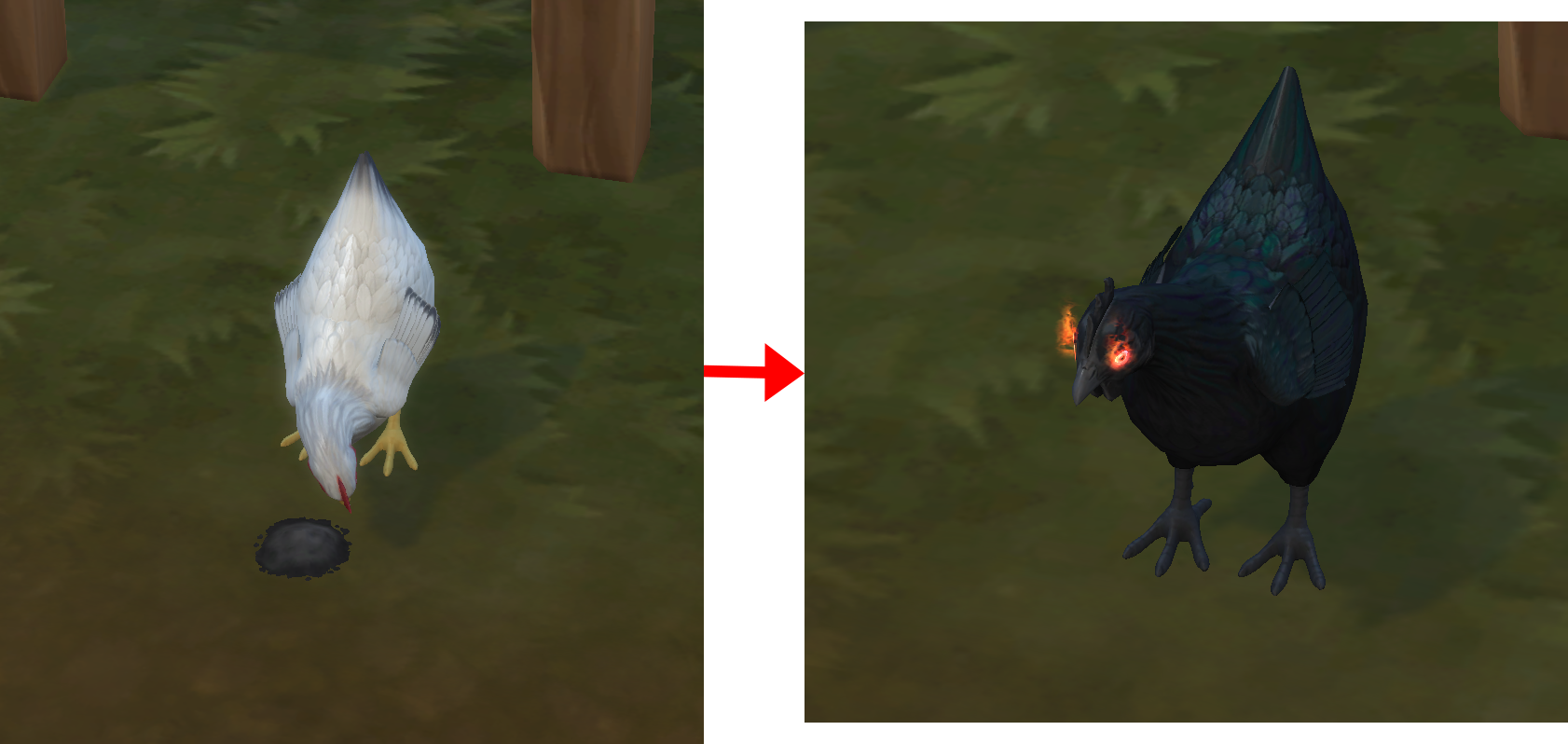 Как получить злобную курицу? Они рождаются из иссиня-чёрных инкубационных яиц, которые откладывают только те куры, которые в серьёзном конфликте со своим хозяином. Обижайте курицу, но насыпайте корм и своевременно вычищайте курятник — и демоническое отродье поселится в вашем доме очень скоро!