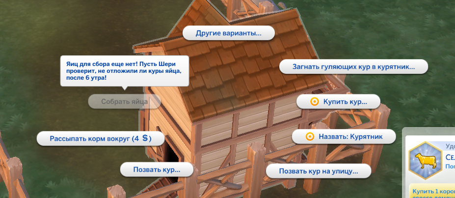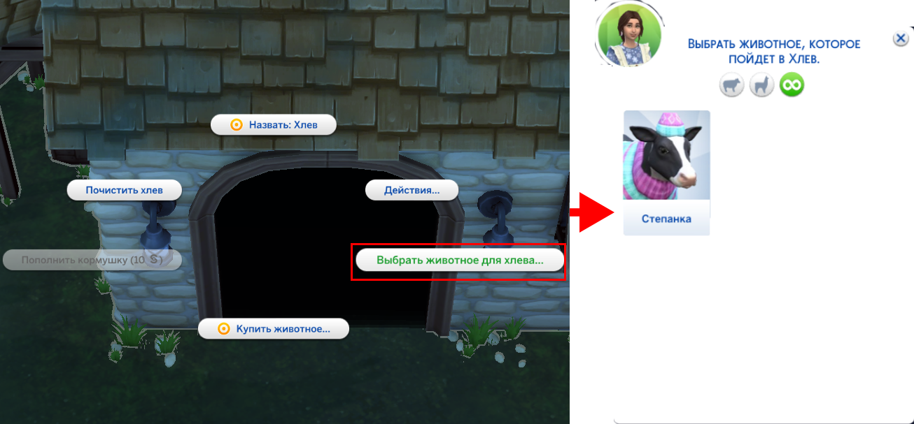По возвращении домой не забудьте вернуть свою любимицу назад! Для этого нажмите на хлев и нажмите на действие "Выбрать животное для хлева...".