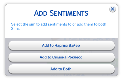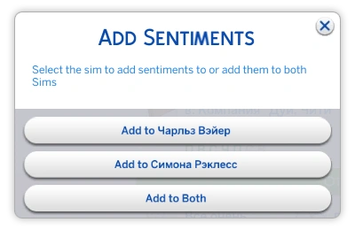 Чит-код на добавление чувств довольно сложен в обращении, но у сообщества всегда есть вариант проще! С помощью мода UI Cheats можно одним нажатием мыши добавить или удалить необходимое вам чувство! Поскольку мод просто добавляет интерфейс для скрытых внутри игры чит-кодов, перевод для этого мода не требуется.