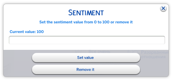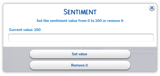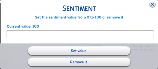 Нажатие кнопки "Готово" подтверждает ваш выбор чувств. При желании удалить какое-либо чувство нажмите правой кнопкой мыши по нему. Откроется меню с пустым полем для ввода длительности чувства (установка на 0 или оставление пустого поля удалит чувство), кнопкой "Установить значение" и "Удалить".