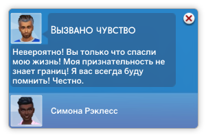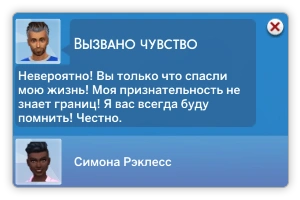 ![]() | Близость после опасности | Чувство близости (кратковременное) | Этот персонаж спас вас от смерти | sentimentTrack_Close_ST_nearDeath |