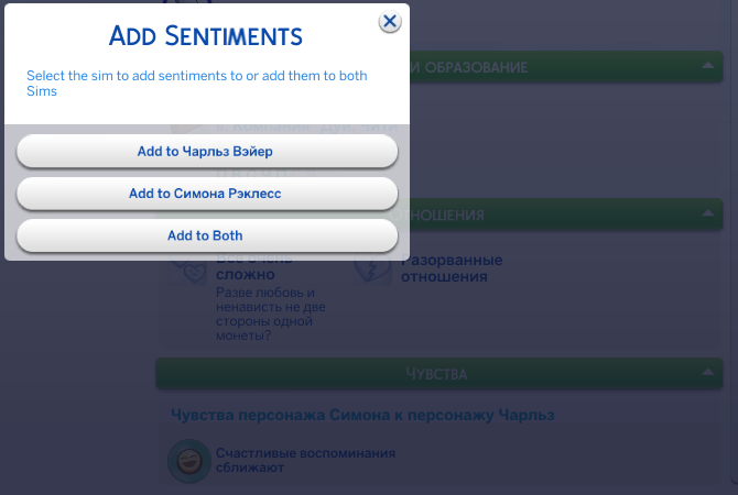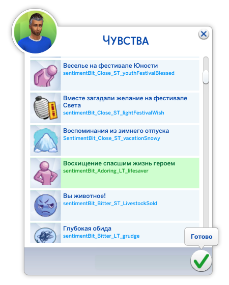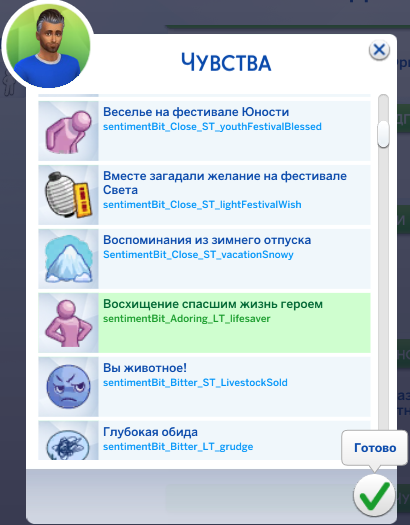 После выбора того, кому добавить чувство, вам откроется список всех доступных в вашей версии игры чувств. Помните, что длительным может быть только 1 чувство, максимум их может быть только 4, и все они одной модальности (или позитивные, или негативные)!