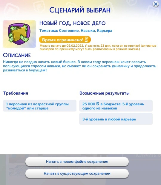 Для его выполнения нового испытания понадобится либо заработать 25 тысяч симолеонов при одном навыке 5 уровня, либо достичь 3-го уровня в любой карьере! Награда: 5 тысяч баллов удовлетворения. Сценарий ограничен по времени до 2 февраля 2022 года, поэтому поспешите опробовать!