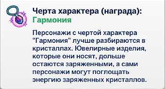 С навыком геммологии в «The Sims 4: Сияние самоцветов» была добавлена жизненная цель в категории "Природа" под названием "Приручение кристаллов". За её выполнение вашему персонажу дадут 1000 баллов удовлетворения, которые вы сможете потратить на полезные награды, а также персонаж получит наградную черту характера — "Гармония"!