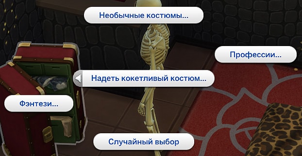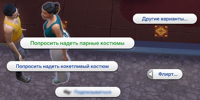 Если на участке, где у вас проходит встреча с партнёром, есть сундук с костюмами, то вы можете перейти в категорию романтических взаимодействий, раздел "Флирт" и выбрать любое из действий "Попросить надеть парные костюмы" или "Попросить надеть кокетливый костюм".