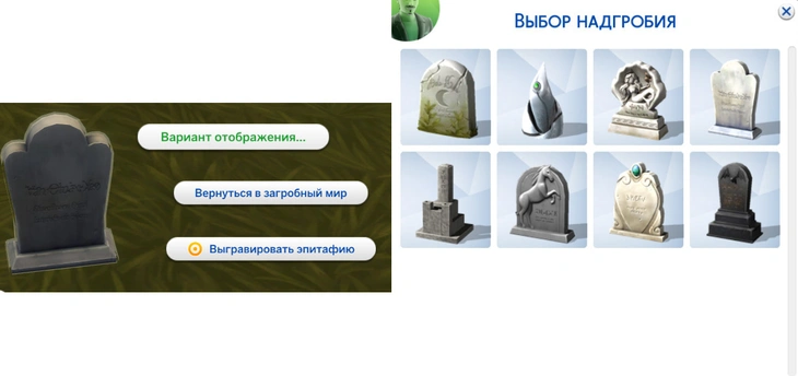 Выбор урн и надгробий в игре