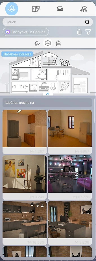 Также имеются шаблоны комнат, которые удобно отсортированы по назначению.