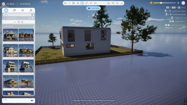Интерфейс выглядит лаконично и стильно, но не совсем удобно. Часть инструментов расположена в верхней части экрана посередине: там вы можете найти настройку отображения стен, перемещение между этажами, отображение сетки, режим привязки объектов к сетке, выделение отдельного объекта или всех стен/полов в комнате, удалить один объект или всё, что расположено на участке. Есть инструменты по перемещению здания иди всего участка. В правом верхнем углу экрана есть ползунок для смены времени суток.