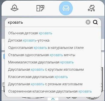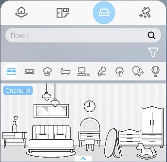 На следующей вкладке "Мебель" размещаются предметы интерьера, которые также отсортированы по помещениям, в которых их обычно устанавливают. Такой подход логически понятен, но отсутствие сортировки по типам объектов (столы, стулья) может показаться некоторым неудобным.