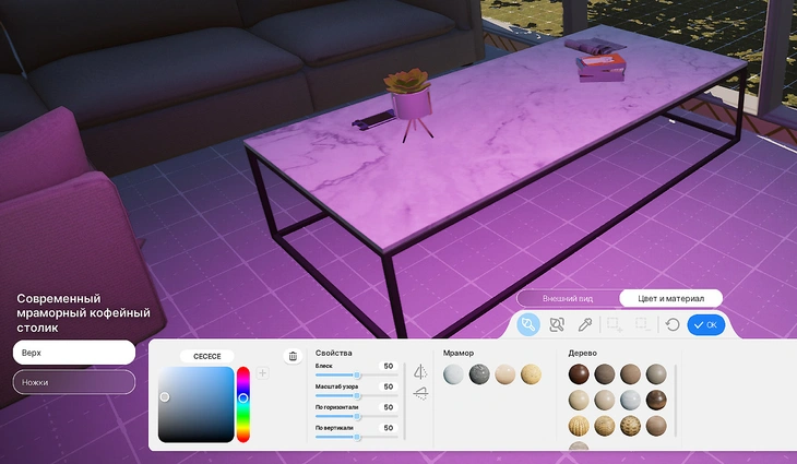 Режим редактирования цвета и материала позволяет тонко настроить практически любой элемент дома под свои нужды. Он напоминает редактор создания стиля из The Sims 3, поскольку имеет цветовой спектр, на котором есть возможность выбрать любой цвет и даже сохранить его на палитру. Также есть возможность выбрать материал, который будет покрывать объект. Для каждого объекта набор материалов свой, и менять его нельзя. У текстуры можно выбрать блеск, масштаб узора и сместить симметрию, с которой он отображается.