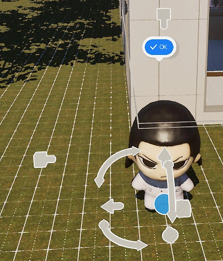 Немного отличается размещение объектов, напечатанных на 3D-принтере. Из-за того, что игра не знает их точного размера, такие объекты имеют более тонкую настройку. Вы можете перемещать объект в трёх плоскостях с помощью стрелок, свободно перемещать, взяв за синий кружок, изменить поворот в трёх плоскостях или изменить размеры объекта в трёх плоскостях с помощью квадратных стрелок.